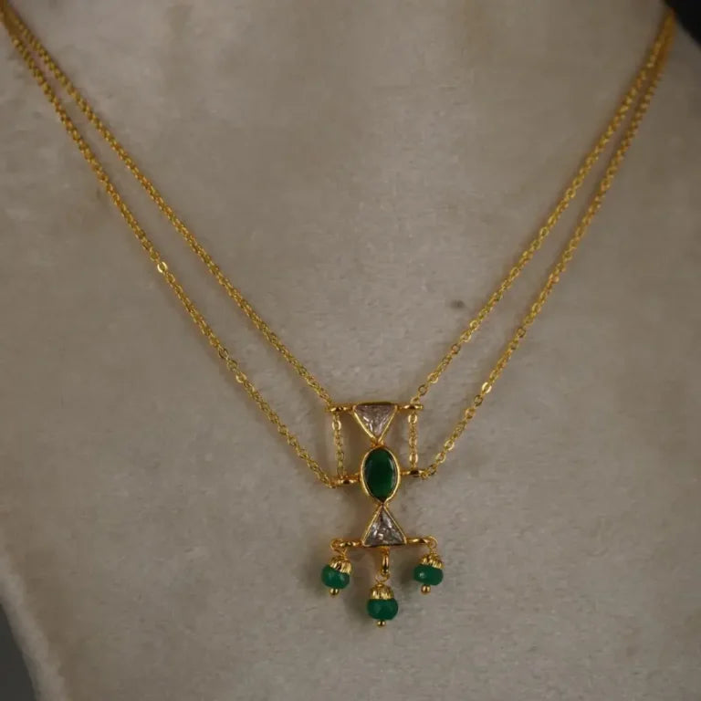 Plain 2 line Chain Centerd With Polki Green CZ Locket Hk0361